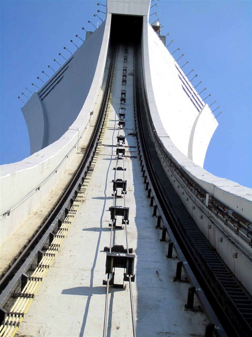 A part of the Stadium, the Montreal Tower, is the highest inclined tower in the world. You reach the Observatory by a 2-level glass funicular that can accommodate 76 passengers at a time. The trip takes less than 2 minutes and is the only one in the world that works on a curved and inclined structure; a hydraulic system allows the cabin to remain horizontal at all times. Once at the top you can look down at the Olympic complex, the roof of the Biodome and then back west to downtown Montreal...they said on a clear day you can see for 50 miles.